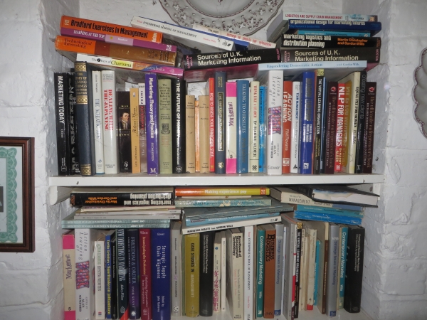 What's on the shelf behind then? With so much chat about the backdrops to HomeWorkers, we felt time for some posing myself. The handheld tome [left] is to distract from the old large white £5 note, Prestonpans Teddy, one Doulton vase of mother's pair, and of course myriad other titles including Olympics records. The tomes to right and then below are some of my 'own' 40 titles and from lifetime colleagues that are gathering dust beneath cobwebs upstairs here in the Dovecot; and just a glimpse of the Madeira pottery we collected there - yes it rained! [Click to enlarge.]