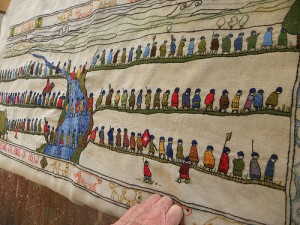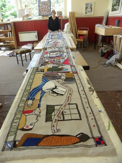 The nearest is the now completed panel of Colonel Gardiner lying on his deathbed at Tranent Manse nursed by Beatrix Jenkinson created by Rhona MacKenzie, with most considerable help from her sister Catherine Morrisson [sisters eh!], whilst Highlanders dine with Beatrix' sister Mary in the kitchen below. And Yes, that's Rosemary Farmer from Australia still here in The Pans taking in the wondrous scenes ....