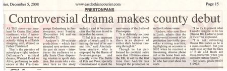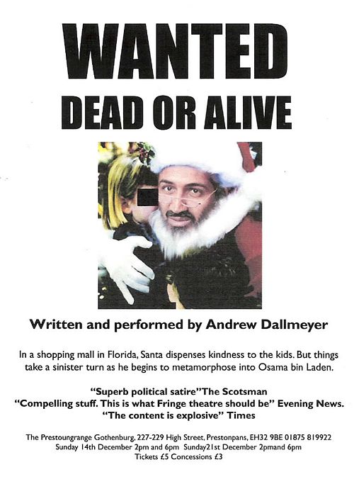 Many of us are now well familiar with Andrew Dallmeyer as dramatist for the Battle of Pots 'n Pans that went to The Fringe this year and toured East Lothian Kirks, but his Bin Laden satire is someting a 'little' different ... and NOT to be missed.