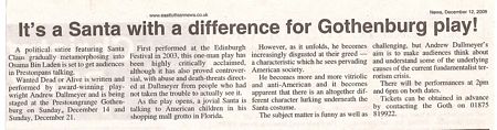 ...and is a political satire written and performed by the playwright himself. In a shopping mall in Florida, Santa dispenses kindness to the kids. But things take a sinister turn as he metamorphoses into Osama bin Laden.
