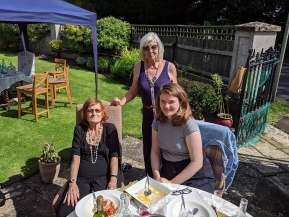 Juliette Healey dressed by request in black is pictured below with Pamela and Audrey … and Pam looks keen on a slice of that home made cake. I had a take-home portion which was a beautiful sponge! We'd wondered awhile whether we'd all be able to make it but the sun shone in Amanda and Nick great garden at The Grange, Edith Weston, and the family was able to socially distance as we must. Catering by Nick was palmary as ever- haddock and chips followed by apple pie and ice cream! Avril opted for home made hamburger and caramel cream. Mathew, Kathryn, Frankie and Maureen were on a stopover from Weymouth/ Ilkley. Nick's sister Michelle, husband Butch and children were there along with Pamela's granddaughters Lizzie + Ollie and Sarah + Jamie + Freddie. Grandson Alex + Stephanie was MC. Pamela was overjoyed and delighted; and she deserved to be!