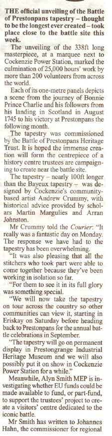 The East Lothian Courier has picked up on the possibility that The Prestonpans Tapestry will go on display at Cockenzie Power Station in its old canteen where the 3Harbours Festival exhibits each year. This would be in addition to its display in Prestonpans Community Centre in September Friday 24th/ Saturday 25th during re-enactment weekend. The Trustees very much hope that such a display at the Power Station will include a major 'corporate' occasion for Scottish Power to showcase its continuing support for our community, with invitees from across Scottish industry.