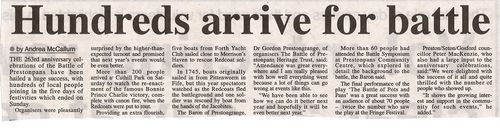 The Friends of Cuthill Park who are waging their interminable campaign for its total restoration as a community asset must have been well delighted by 2.30 to see the Park buzzing with over 300 gongoozlers and re-enactors. The re-enactors spun their regimental yarns and the canoniers made ready with flying sods. The redcoats set out a picket line and practised their drill. Highlanders appeared from behind scrubland in brief forays which ere long captured the redcoats canon turning its fire on the redcoats instead. Then came the fabled Highland charge... with cries and shrieks the pipes a'wailin. The redcoats tussled in vain, but soon fled towards Morrison's Haven where to close the programme they sought to flee across the Forth with the asistance of gongoozlers from the Forth Yacht Club who had sailed across from Pittenweem to watch the battle. Only one escaped, as history tells us. The rest were made prisoner.