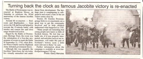 The partying began at Edinburgh's Mercat Cross at noon on the 17th, 263 years on from the original occasion when Heralds and The Prince made their Proclamations. Next there was an Exhibition and Reception at Holyrood hosted by Iain Gray, our MSP lately elected national Labour Leader - almost certainly with Hanoverian ancestry. The following morning a two day HLF part-sponsored Symposium began at The Pans Community Centre with talks on Day 1 and the Battle of Pots 'n Pans at 7.30pm; then glorious interactivity throughout Day 2 with youngsters, Janet Paisley's authors workshop, the launch of the autumn battlefield archaelogical studies by Glasgow University and Gordon Veitch's 1745 BattleGaming programme.