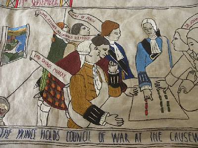 Bonnie Prince Charlie and the Clan Chiefs were spoiling for a fight having narrowly missed Cope at Dalwhinnie on August 28th/ 29th. On September 19th the Highlanders marched out from King's Park to Duddingston and the Prince held Council of War in the Cottage on the Causeway, later taking refeshments at the Sheep Heid. [Panel #55 by Meg Porteus.]