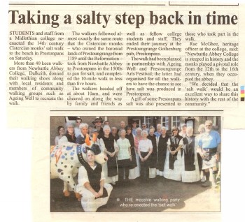 The main thoroughfare through neighbouring Wallyford has long been known as Salters Way and an initiative is about to be taken by Dolphinstoun and Malcolm Scott to discuss with Wallyford Community Council how that might be better 'interpreted'. The rationale is perhaps unusual. Dolphinstoun has lately disponed gratis that portion of his solum land at Strawberry Corner to Malcolm Scott which was necessary to enable the proposed new Wallyford road to the east to meet the old Great North Road at a new roundabout. [Malcolm Scott, for the record, is the lead developer for the ambitious plans at east Wallyford and a long standing supporter and Trustee of the Battle of Prestonpans Heritage Trust.] In return for Dolphinstoun's donation to the development plans Malcolm Scott is keen to reciprocate and support research and 'interpretation' of Salters Way. So keep walking Newbattle ... you've raised the salters' profile and it's getting traction!