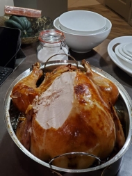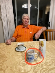 BIG news this week was the celebration of Canadian Thanksgiving Weekend. Christopher set the ball rolling in Edmonton with his invitation on Saturday for Bryan, Joan and Anne to join him in his new apartment for it first ever Turkey Roast - depicted below centre. There were also delicious scones and lemon cheese cake at the very bottom … Not to be outdone Mathew in Ilkley [remembered in Bryan's tea mug he was pleased to see as Tailend Charlie below - click to enlarge] went shopping for Bernie Matthew's turkey cutlettes and he indulged himself with many sprouts and it appears maple syrup? Stephen and Wendy, of course born and bred, celebrated on the actual day, Monday, with the whole family in attendance. More modestly in Milton Malsor Avril and I made ready with Ocean Spray Cranberry sauce with full cranberries, sprouts and parsnips - all courtesy of Morrison's which provided just a side of turkey that also came cold on Monday and fine currie on Tuesday! Avril's crop of ripening tomatoes from our front garden provided the only visible harvest across the ocean! We dined beneath the elegantly relit lamp [including Elliot's sunglasses] and for the table from our garden the still flowering Dahlias Cactus and Nerine Guernsey Lilies.
