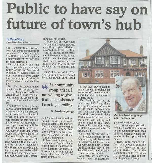 Gordon Prestoungrange announced in the autumn last year that The Gothenburg [The Goth] will be put up for sale in April 2017. But he was optimistic that the 'community at large' might wish to get in first to ensure it carries forward the traditions which frankly date back to 1908 - those famed Gothenburg Principles!