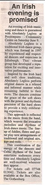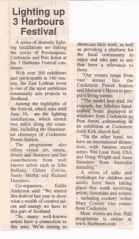 The achievements of the Three Harbours Festival lead-team of Eddie Anderson, Adele Conn, Andrew Crummy, Tom Ewing, Gillian Hart and Yvonne Murphy are truly outstanding. Richard Demarco says so, John Bellany too and Sandy Moffat and Wei Luan ..... Not since the heady days 20 or 30 years ago at the Craigmillar People's Festival has anything like it been seen in the Lothians. It came out of the blue ....