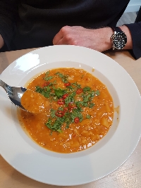 Home Made Soup then … The word went out that something remarkable is called for so here's the outcome. Mathew suggested Baked Bean Soup in honour of Grandpa Reg Turner for Ilkley … that was second to Heinz Tomato Soup. What he might have enjoyed is Porter's Roast Tomato and Lentil Soup from Silverstone as shown below right! [Congratulations Tony & Sylvia.] Too much snow affecting them up there in Ilkley it seems … Avril's preparation brought out the silver soup ladle and the Korean Tureen as well as the Lion's Soup Bowls to contain Home Made Leek and Potato; delicious. At the Manor House, alerted yestereve, Lady Dolphinstoun crafted Thai Red Curry Squash and Lentil Soup which the grandsons found not to their liking but the Baron clearly enjoyed greatly.