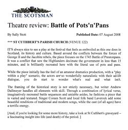 Complete with period costumes, the cast of the Battle of Pots 'n Pans lay siege to Edinburgh’s chaotic High Street in manoeuvres that would have made the Bonnie Prince Proud! It's no easy task to wrestle for the attention of thousands of visitors to the city of Edinburgh but, hey, aren't Pans folk made of stern stuff - the unicyclists, bearded women, balloon blowers and jugglers had no chance? Natural born sellers of our arts by craft. Not shy then. At least 700 leaflets were inserted into the hands of unsuspecting Redcoats (ok Americans, French, and Chinese etc.) - we came at them from behind - wearing our smiles and a short explanation of the significance of the Battle of Prestonpans so if they didn't come to the show they'd have heard about one of the most significant events in Scottish history anyway. The atmosphere was breathtaking, the city electric and alive.