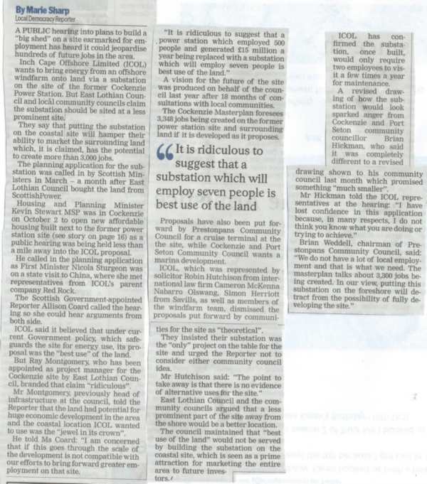 What is it about Inchcape's approach? They have us all onside about bringing the offshore energy ashore to access the National Grid and they keep making 'ridiculous' proposals. Why not have a chat with ELC and put it peaceably where it can do its important work and share in the imaginative development of the balance of the site? Please. Is it that difficult … now that ELC is the landowner of it all?