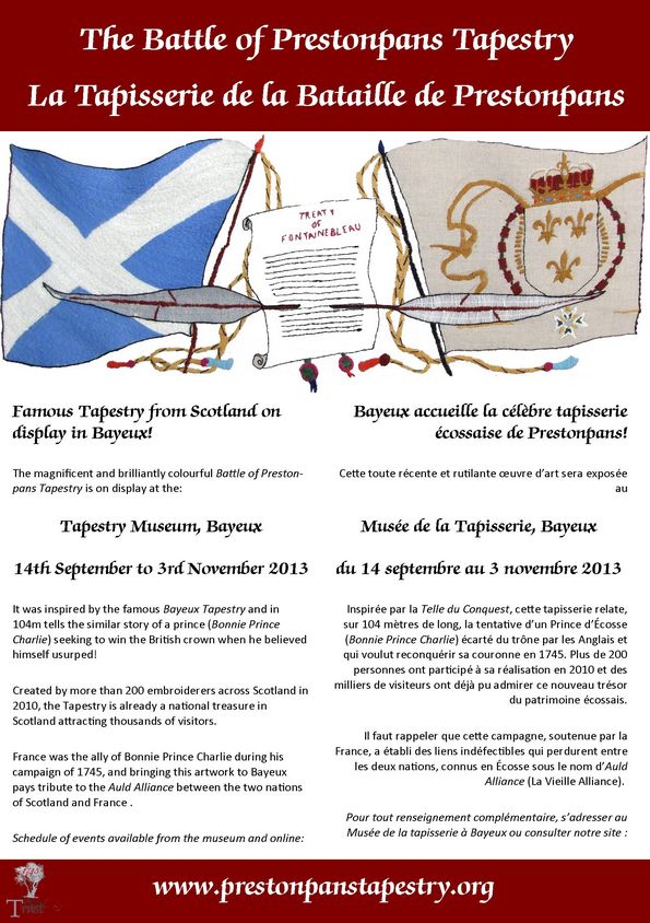 Très bientôt, notre Tapisserie sera sédentarisée à Prestonpans. En attendant ce grand jour, nous avons le plaisir de la faire voyager dans le monde entier. Depuis 2010, date de son achèvement, 44 expositions ont eu lieu en Écosse, en Angleterre, et une fois en France, l’an dernier, à Pornichet, car c’est de Saint-Nazaire que le Prince s’est embarqué pour la reconquête de son trône.