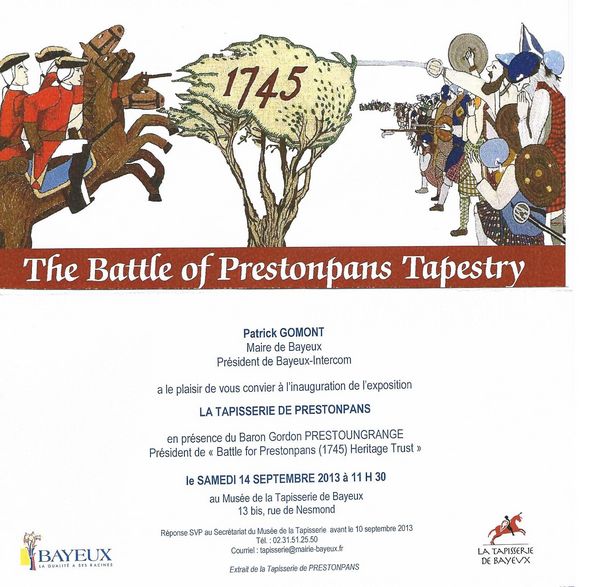'Être ici, à Bayeux, aujourd’hui, pour le vernissage de cette exposition de notre Tapisserie de Prestonpans est pour nous un très grand plaisir. C’est de ma présence en ces lieux, en compagnie de mon épouse, Lady Avril, en 2007, qu’est né l’ambitieux projet consistant à mettre notre histoire sur une tapisserie à l’image de la vôtre.