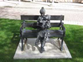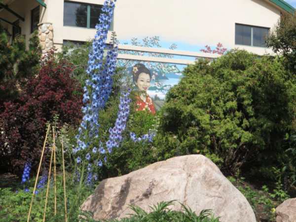 So in slack time during the Exhibition your Editor here was able to return again to Stony Plain and take a look at the murals ... [and the seated sculptures!] .... and particularly recall the town's longstanding twinning with Shikaoi in Japan so beautifully commemorated on the Town Hall - below. The respective Mayors cross dressed!