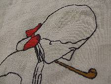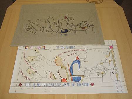 The illustration below is being stitched by Helen MacLean, Panel #12 @ Borrodale House. It shows the Prince despatching messengers seeking support for his Campaign and its planned launch at Glenfinnan on August 19th. Another intriguing comparator here with the Prince's depiction. Smoking eh; and is that white wine in his goblet? It's clearly black ink in the ink-well.