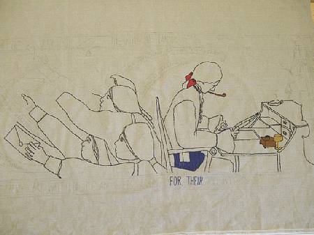 Their kindness to the Prince shines through in a prodigous stitching effort going along right through the past bleak winter months, with weekly workshops in Eriskay Village Hall. Each time the team goes home re-fired to tackle a further element of the embroidery.