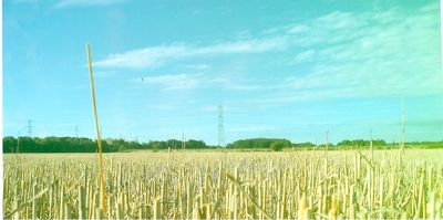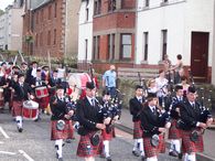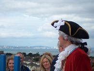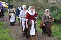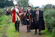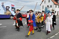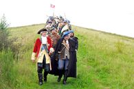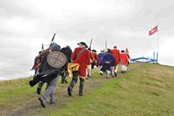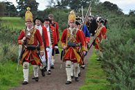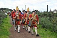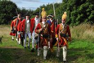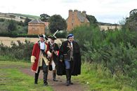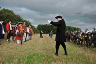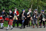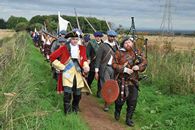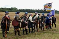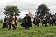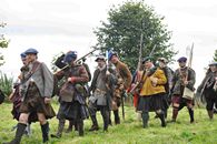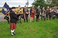 Accompanied by the Alan Breck Regimental Pipes and Drums, before noon the re-enactors marched from Bankton House to climb the Battle Bing to honour the Prince's Battle Flag flying high there; then they marched down along to the Memorial Cairn where the Prince laid a wreath to all who died in 1745. After that the two armies marched north along the Waggonway to re-enact the Highland Charge across that obstacle and the cornfield stubble both sides of it just after dawn on 21st September 1745, with the redcoats fleeing west before them towards the unwelcoming walls of Preston House. The first picture by John Lindsay shows that very cornfield, without the snooks or sheaves it would have had in 1745, just after harvesting early this September. Many of the other pictures were taken for the Trust by Supporter Garry Menzies.