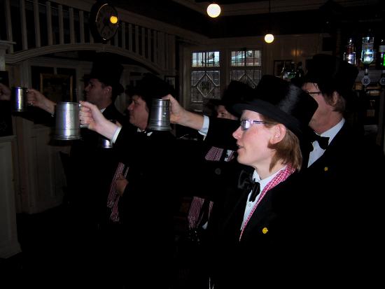 The picture below shows the Porter Drinkers' Association facing Goteborg [ESE from the James Fewell Bar we reckoned!] and proclaiming their traditional toast: Porter! Porter! holding high their traditional pewter tankards.