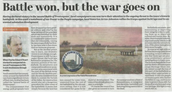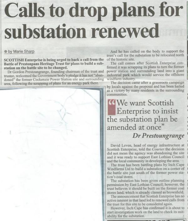 So, whilst it is excellent news that Scottish Enterprise and East Lothian Council are no longer proceeding with the gigantic scheme for an Energy Park at Cockenzie, Inchcape are still intent on building their Offshore Wind Energy SubStation on the 1745 battlefield. Wessex Archaeology are shortly to commence exploratory work there.