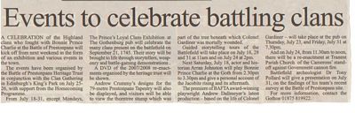 The Clans who were with The Prince on September 21st 1745 are especially celebrated - the Camerons, Stewarts, MacGregors, MacDonalds, MacDonells, Atholls, Robertsons and MacLachlans. Storytellers will be on hand throughout to bring the battle to life, and the Trust's dvd of the 2007/2008 re-enactments will be presented.