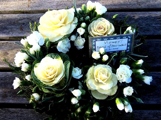 In modest thanks, each year the Battle Trust lays a wreath at the Swarkestone Cairn erected in 1995. This year ornamental cabbage and carnations provided the tribute, white roses from Fassefern being unavailable!