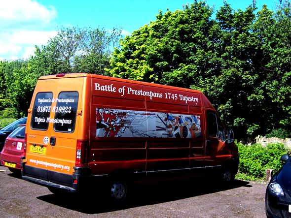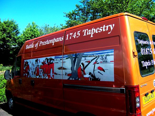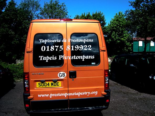 The tailgating motorist will see French and Gaelic as well as our url. On the side panels the Tapestry itself is depicted and at the front the Fowler's logo and a reminder that The Prestoungrange Gothenburg is indeed our arts hub.