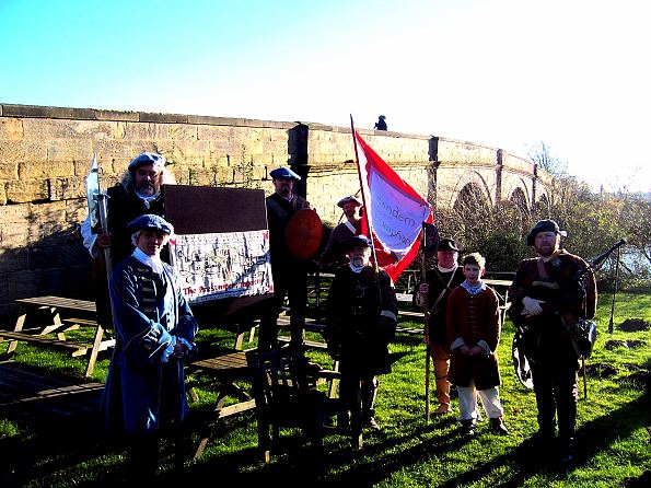 The bridge lies not in the City but in South Derbyshire and as ever the Chairman of the District Council was present to inspect the re-enactors. This year it was, for his third time as chair, Cllr. Michael Bale. We captured him in front of the tapestry panel with the bridge behind whilst he was kindly volunteering to see what might be achieved next year by way of a wholehearted display of all 105 panels.