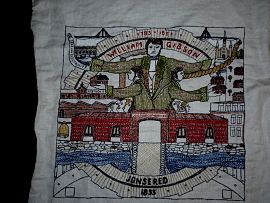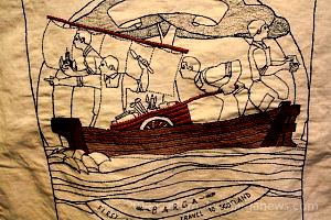 At present, Diaspora 'pilot' panels are in hand in Gothenburg, Sweden and in Prestonpans twin town Barga, in Tuscany. It's being designed, as for the Prestonpans Tapestry, by Andrew Crummy and is led and co-ordinated by Prestoungrange Arts Festival. However, its design style certainly differs considerably with 500mm x 500mm panels as opposed to 1000mm x 460mm in the Battle Tapestry.