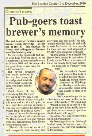 A commemorative WeeHeavy Brew is planned by 'Uncle Charles' who has worked with Roddy this past 18 months in the microbrewery. It will be crafted in the New Year when CAMRA and family friends and all his customers alike will be invited to The Gothenburg. In the immediate future the brews Roddy had already completed are still available and many a toast is being drunk to Roddy's contribution in The Pans helping to keep the name and flavours of Fowler's alive.