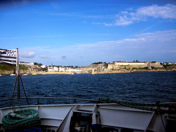 Certainly as he approached Le Palais on La Belle Isle he would have seen the Citadelle Vauban rising up as it still does to this day; although the Breton flag aboard our ship is an anachronism! [Not introduced till 1926.] And once ashore the Prince could see the splendour of its harbour - in starkest contrast with the Atlantic coastline to the NW of the island. Pictured as it was below on a beautiful day in stormy weather it would be an impossible haven for any ship.
