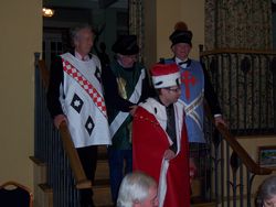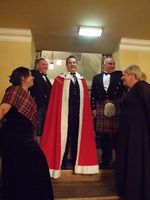 Pipe Major Richard Feirney of the Alan Breck Regimental Pipes and Drums [aka Prestonpans Royal British Legion] welcomed the 60 guests to dinner in the Thomas Nelson Suite prepared by Andrew Laurie, the Gothenburg's fine chef. Six Barons acted as table hosts to the assembly and the newest amongst them Baron Newabbay made the now traditional speech and his pledge, attended from his dinner table by three Heralds Quite Extraordinary adorned in tabbards created for just such occasions.