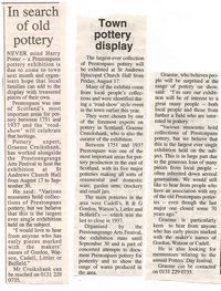 The Scottish Arts Council was invited to give support to the Arts Festival for the Exhibition and the educational work involved [but not the definitive publication]. The Prestoungrange Arts Festival is delighted to announce that the Scottish Arts Council has lately agreed to provide £5,000 towards the total expected cost of £20,000. Graeme Cruickshank has been at work on the project and writing the definitive Guide for some three years. Its appearance from 'Prestoungrange Univeristy Press with Burke's Peerage' in late August will be the first occasion that a comprehensive book solely devoted to Prestonpans Pottery has ever been published. Whilst its cover price will be £18.95, single copies will be available to all attending the Exhibition at £10. Commemorative souvenir mugs will also be available and Gillian Hart, who is co-ordinating the Exhibition also has a programme of events and visits scheduled. Any group wishing to bring a party along should contact Gillian on 01875 819922.