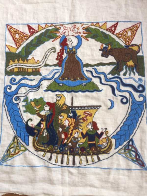 The Scottish Diaspora Tapestry has received a most extraordinary and beautiful gift from tapestry stitchers in Iceland. Inspired by our 305 metre tapestry, which was exhibited in Eyjafjardazsveit, Nordland en route back from Canada in February 2017, Icelandic stitchers have created 5 Panels and donated them to us to be exhibited as may be possible in the years ahead – the first in Prestonpans. The Presentation takes place in the Scottish Parliament on June 3rd 2019 at 6pm with many of those involved present. The five Panels are all drawn from The Book of Settlements and the tale behind each is given below.