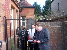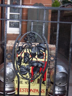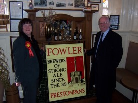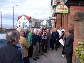 There were the regular drinkers and diners of The Goth since 1908; CAMRA supporters of Fowler's Finest Prestonpans Ales; the Chairman of the Community Council [of course]; the former Provost Pat O'Brien who was instrumental in the Goth's Listing; a Westminster Parliamentary candidate on May 6th, Fiona O'Donnell [born just 10 miles from Chemainus at Nanaimo, who knows a Cowichan sweater and totem pole when she sees them]; Poet Laureate John Lindsay ready to recite; Tom Ewing leading the evening's serenades ... and of course principal actors in Lynne Shroder with husband Jim who restored and re-hung the Auld Fowler's Gate; John Greenwood with the Auld HQ's art deco wall clock and its irreplaceable Mercat Cross in linoleum cuts; Miss Blake was with us again, she who worked for many a post-war year in the Auld HQ; and not least Roddy Beveridge who made the Wee Heavy [and the ever popular Porter] which was drunk, and drunk, and drunk again in appropriate half pint measures only.