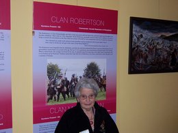 So, the ANZAC Commissioner was able to visit the very spot where his ancestor was wounded at Tranent and the party later joined the Trust at the Gothenburg to view the Prince's Clan Exhibition and pose for a photograph beneath the Cameron detailing. One octogenarian Cameron clanswoman also owed allegiance to the Robertsons and determinedly stood by their panel too!