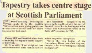 Arran Johnston [quoted below] as Tour Manager took the tapestry to Holyrood last week ... in a partial and 'private' exhibition sponsored by Iain Gray MSP