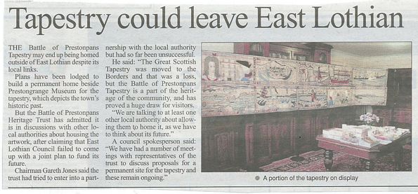 To cut a very long story short, as they say, the Trust will be resolving at its 4th Biennial Scottish National Battlefields Symposium in The Pans on October 24th whether it should call it a day ... and quite simply let the tapestry head off to one of the several others who have expressed a serious interest.