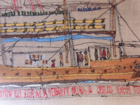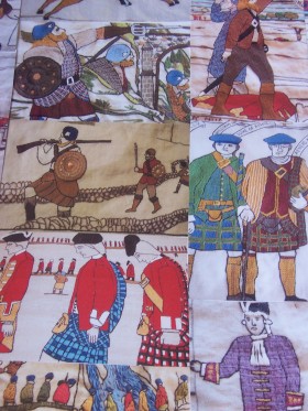 The reverse images show firstly Cope's arrival at Berwick on Tweed to confirm the news of his defeat to Lord Kerr - as lampooned in 1745 which cartoon was Andrew Crummy's starting point for the total design of our tapestry. The second reverse image is of L'Elisabeth taking 700 French soldiers aboard at La Belle Isle - this ship engaged HMS Lion in battle off The Lizard a few days later and had to turn back from the damages it sustained including the death of its Captain. L' Elisabeth never reached Scotland although du Teillay sailed on to Eriskay.