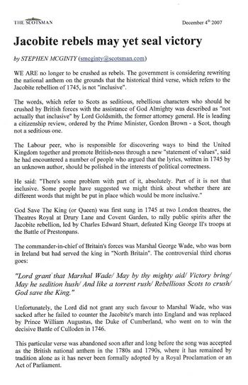 A hapless Lord Goldsmith is responsible currently for encouraging greater Britishness and has questioned some verses in the National Anthem which focus upon the Scots - as a result of their stunning Victory in Prestonpans in September 1745.