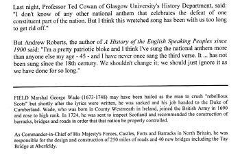 No other peoples in the United Kingdom seem to merit such a focus in the National Anthem. Not even the Irish. And the words were honestly expressed in l745 if you were not a Jacobite supporter. And what is even more to the point the wish was fulfilled. The Scots who followed HRH Prince Charles Edward were crushed - not however by Field Marshall Wade. His final moment came when he presided over the Court of Inquiry into why General Sir John Cope so calamitously lost the Battle of Prestonpans on September 21st 1745 - and exonerated him. Sound familiar? Blamed the dragoons and the foot soldiers.