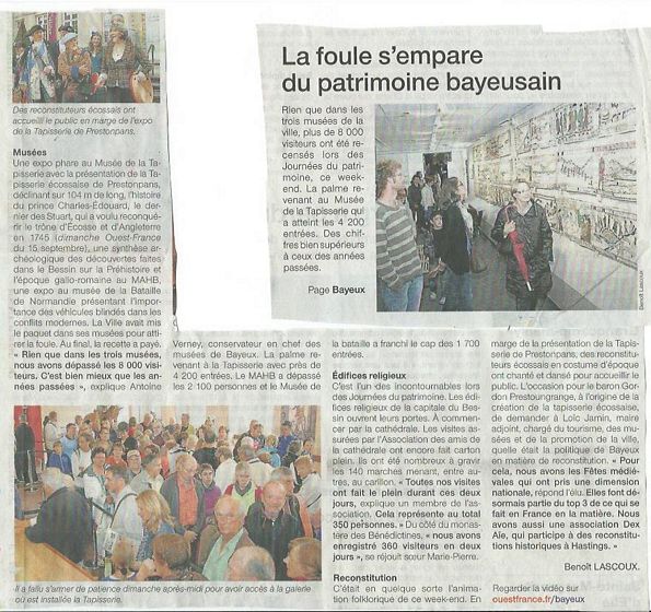 The Inauguration of our Exposition in Bayeux coincided with Les [Deux] Journees du Patrimonie - for these celebrations, entrance to all museums is free across France. As the press cuttings below show this brought 4,100 visitors to our own Tapestry as it appeared alongside its 1000 year old inspiration, and a total of 8,000 across Bayeux.