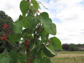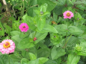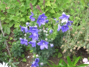 Above left are Avril's much admired East Asian blue balloon flowers, platycodon grandiflorus, and the zinnias growing at the foot of the runner beans.