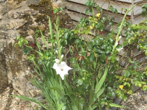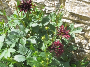 Hola, muy bien is all we've heard so far …. and the same can be said for the new blooms appearing around The Lodge. We are putting the gladioli in the bed with Sylvia's yellow rose next to the flag - leaving good space for the runner beans and more below. I've twinned that with the mysterious cactus flower dahlias that have appeared next to the front garage wall; great colour.