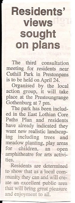 As advised below in both the East Lothian Courier and East Lothian News and with door-to-door flyers, the third open consultation meeting of the Cuthill Park Action Group will be held at The Prestoungrange Gothenburg at 7 pm on April 24th.
