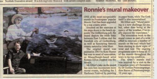 The storms of 2010/ 2011 did a great deal of damage along the Pans shoreline and the victims included Kate Hunter's John Muir/ Gothenburg Mural which the Lord Mayor of Gothenburg, Sweden, had unveilied in 2003. So remediation and/or regeneration was required. For the first time since the Murals Trail was launched a decade ago, simple restoration was not possible. The damage was too great. So the Prestoungrange Arts Festival confronted the 'big' decision which all ageing Murals Towns eventually face: do we replicate with a new artist, re-interpret the storyline from the original mural, or create a wholly 'new' storyline? After much deliberation it was decided to invite Ronnie Elliot to re-interpret. We all agreed that John Muir and the town's connections with Sweden's Gothenburg were vital elements of the stories recounted on our walls.