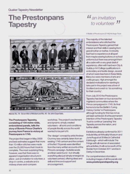 The Quaker Tapestry's Newsletter in January 2011 included the following piece: