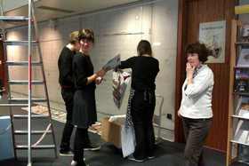 Before the Grand Opening of course, there was work to be done behind the scenes! Pictured below are The Stitchers team setting up including Andrea Cooley, Margaret in background, Kay Speirs left and Liv Kalkreuter - the Cultural Centre's leader.
