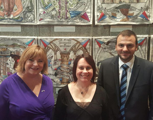 [Fiona Hyslop visiting Scottish Diaspora Tapestry in Paris with Valerie Fregona, Présidente Association Jumelage Boussy Saint Antoine and Romain Colas, Mayor of Boussy-Saint-Antoine]