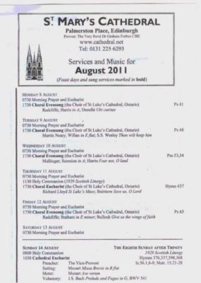 'Visitors continue to stream through the cathedral all afternoon, supplemented at 5.30 pm by worshippers attending Evensong. The visiting choir is from St Luke's Episcopalian Cathedral in Sault Ste. Marie, at the head of Lake Superior in Northern Ontario. They sing Mallinger; Sumsion in A; and Harris' Fear not, O land as the anthem.